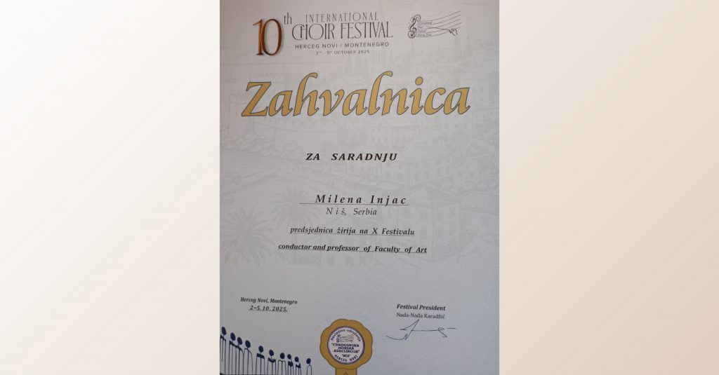 Проф. др ум. Милена Ињац, диригент и декан Факултета уметности у Нишу, била је председник жирија јубиларног 10. Међународног фестивала хорова у Херцег Новом у Црној Гори. Чланови жирија су били Јасенка Остојић (Хрватска), Енрико Миарома (Италија) и Јарун Бекерс (Белгија). Фестивал је одржан од 2. до 5. октобра 2025.…