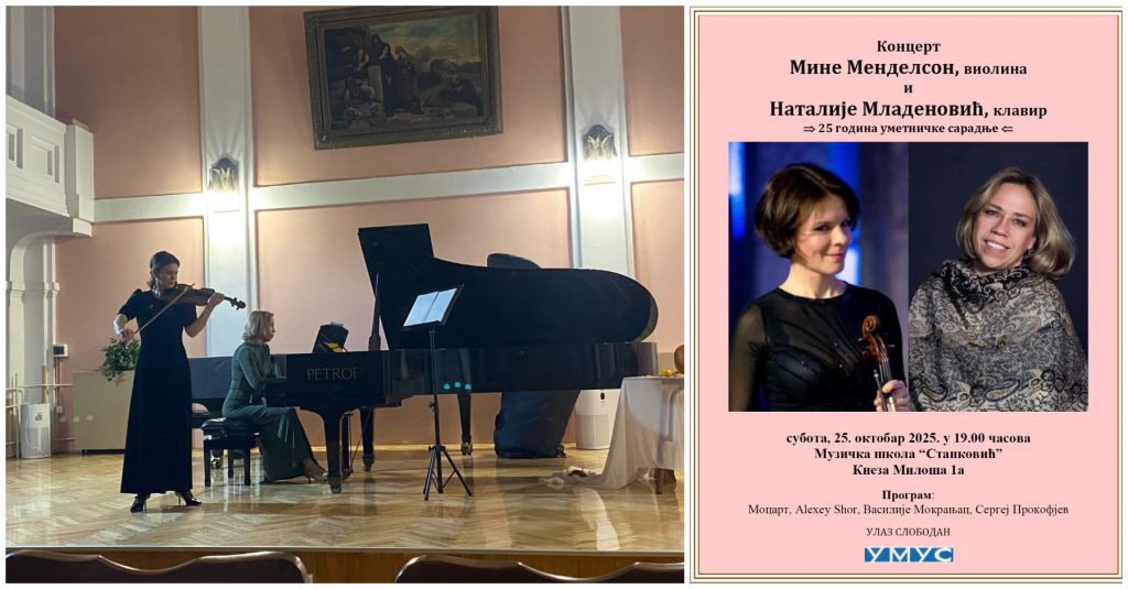 Редовни професор Факултета уметности у Нишу, виолинисткиња др ум. Мина Менделсон одржала је целовечерњи концерт 25. 10. 2025. године у Свечаној сали МШ „Станковић“ у Београду, са пијанисткињом Наталијом Младеновић, у организацији УМУС-а. Овај концерт је још један у низу којим Мина и Наталија обележавају 25 година уметничке сарадње. На…