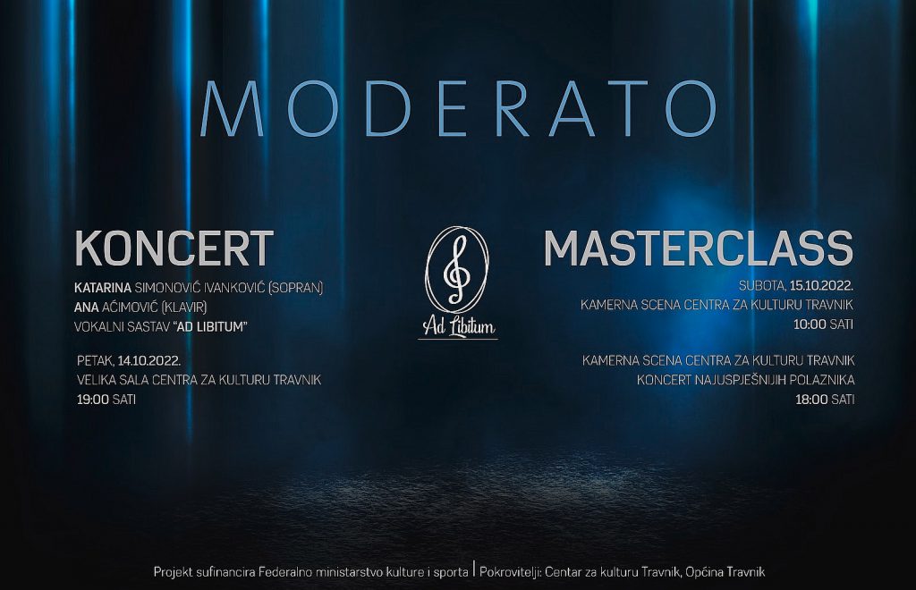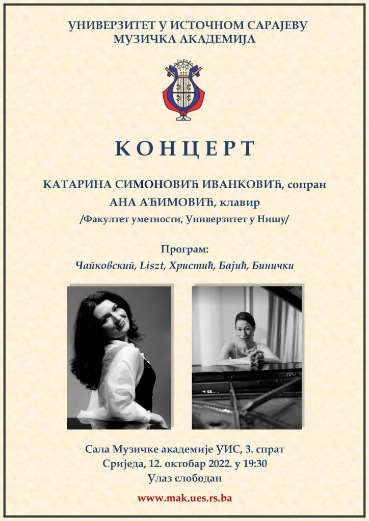 14.10.2022.год. у великој сали Центра за културу, Травник (БиХ), у оквиру пројекта “Модерато” удруге Вокалног састава “Ад либитум”, мр Катарина Симоновић Иванковић, ванр. проф. Факултета Уметности у Нишу, одржала је солистички концерт – реситал. Клавирска сарадња: мр Ана Аћимовић, самостални стручни сарадник на Факултету Уметности Приштина – Звечан (КиМ). На…