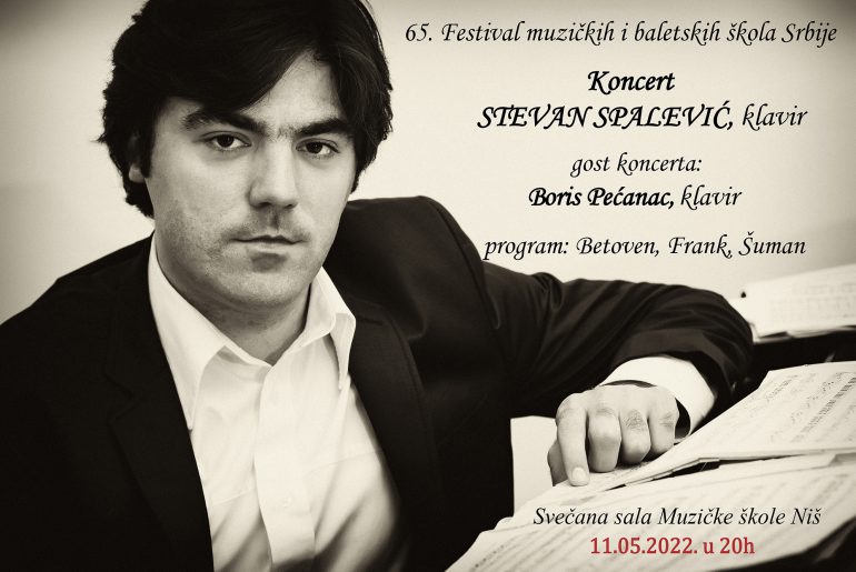Ванр. проф. др ум. Стеван Спалевић одржао је концерт у Свечаној Сали Музичке школе у Нишу у оквиру 65. Фестивала музичких и балетских школа Србије. Гост на концерту био је студент ИИИ године клавира Факултета уметности у Нишу Борис Пећанац. На програму су се нашла дела Л. В. Бетовена, Р.…