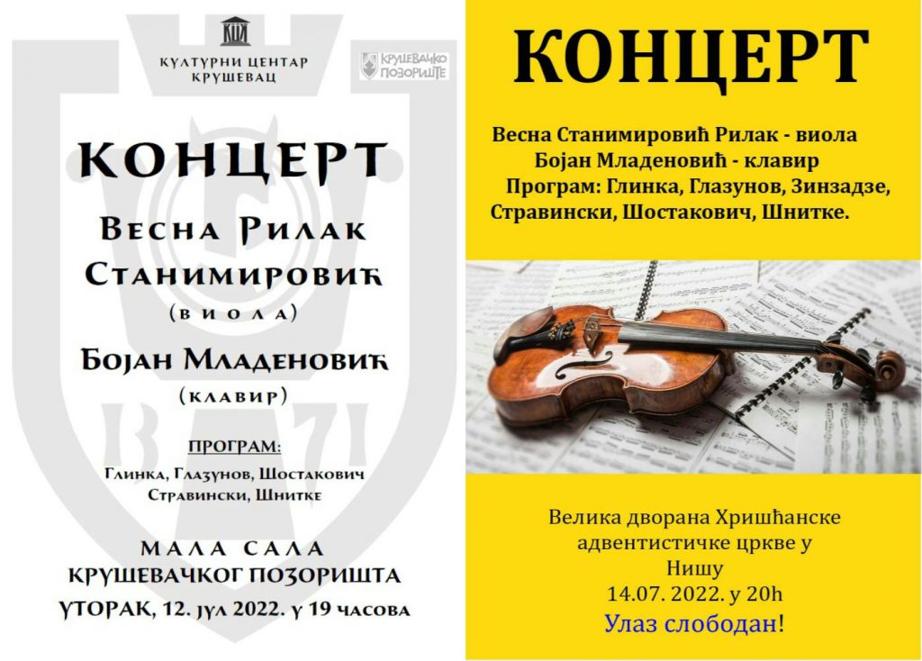 Мр Весна Рилак Станимировић, ванредни професор виоле, са пијанистом спец. Бојаном Маденовићем, стручним сарадником, одржала је два целовечерња реситала: 12.7.2022. год. у малој сали Крушевачког позоришта, и 14.7.2022. год. у великој дворани Хришћанске адвентистичке цркве у Нишу. На програму су била дела Глинке, Глазунова, Шостаковича, Зиндзадзеа, Стравинског и Шниткеа.