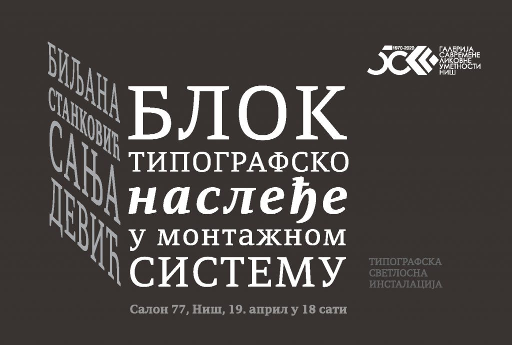 Изложба под називом БЛОК – типографско наслеђе у монтажном систему, ауторки ванр. проф. Сање Девић и доцента др ум. Биљане Станковић, биће отворена у уторак, 19. априла у 18 сати, у галерији Салон 77. “…Салон 77 Галерије савремених ликовних уметности у Нишу, природно се наметнуо као савршени простор за излагање…