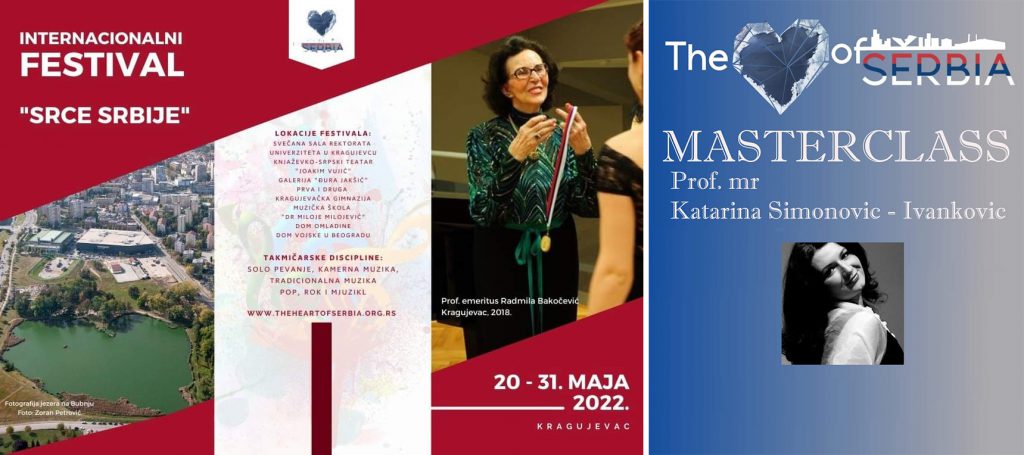 На интернационалном фестивалу “The hart of Serbia 2022.” у Крагујевцу, мр Катарина Симоновић Иванковић, ванредни професор Факултета уметности, биће члан жирија на такмичењу соло певача од 20. до 31. маја 2022. године. У оквиру Фестивала, поред еминентних соло певача, предавача из иностранства, мр Катарина Симоновић Иванковић одржаће и мајсторски курс…