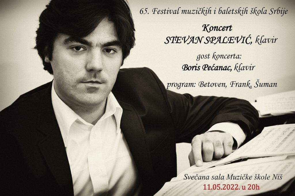Ванр. проф. др ум. Стеван Спалевић одржао је концерт у Свечаној Сали Музичке школе у Нишу у оквиру 65. Фестивала музичких и балетских школа Србије. Гост на концерту био је студент ИИИ године клавира Факултета уметности у Нишу Борис Пећанац. На програму су се нашла дела Л. В. Бетовена, Р.…