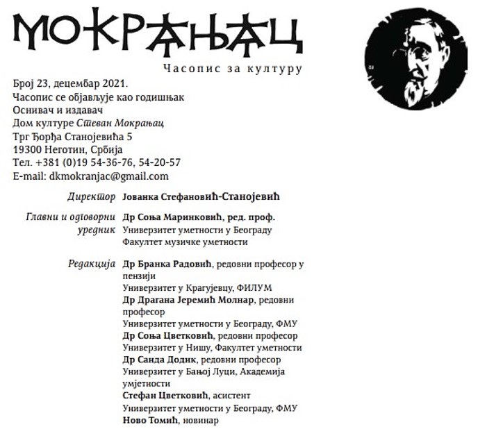 Др Соња Цветковић члан редакције националног научног часописа “Мокрањац”