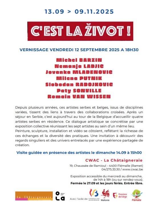 Изложба под називом: “C’EST LA ŽIVOT !” заједнички је пројекат аутора из Белгије и Србије. Седморо визуелних уметника: Мишел Барзен, Јованка Младеновић, Немања Лађић, Пати Сонвил, Слободан Радојковић, Милена Путник и Ромен Ван Висен, након радног боравка реализује поставку у Centre Wallon d’Art Contemporain у месту Флемал у Белгији. Пројекат…