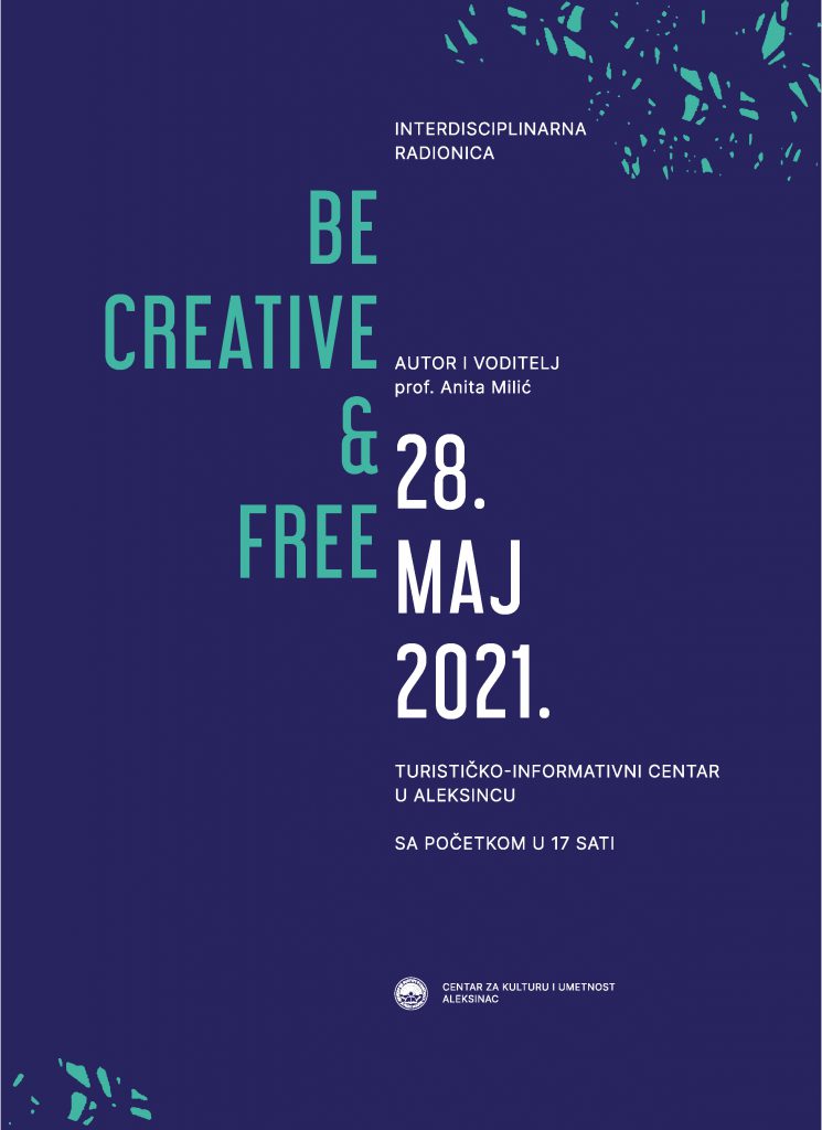 Ван. проф. Анита Милић oдржaлa je рaдиoницу “BE CREATIVE & FREE” у чeтвртaк, 28. мaja 2021. гoдинe, сa пoчeткoм у 17 чaсoвa у Tуристичкo-Инфoрмaтивнoм Цeнтру у Aлeксинцу.