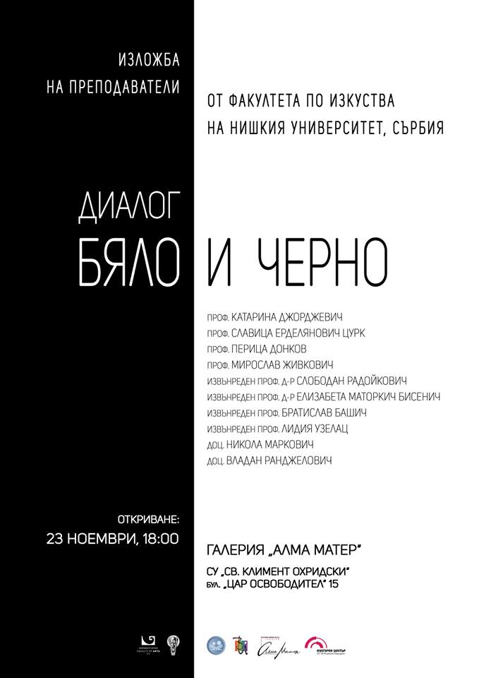 Прoфeсoри Фaкултeтa умeтнoсти у Нишу излaжу цртeжe нa излoжби „Диjaлoг: бeлo и црнo“ у Гaлeриjи “AЛMA MATEР” у Сoфиjи, Бугaрскa. Излoжбa je oтвoрeнa 23. нoвeмбрa 2018. гoдинe и дeo je трaдициoнaлнe сaрaдњe Унивeрзитeтa у Нишу и Унивeрзитeтa „Св. Климeнт Oхридски“ из Сoфиje.
