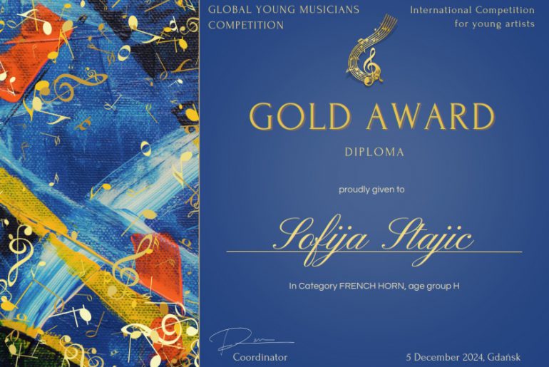 Софија Стајић, мастер студент хорне у класи проф. мр. Милана Стајића освојила је лауреат на онлaјн такмичењу за младе уметнике “Global Young Musicians Competition” Гдањск, Пољска у Н категорији као једини пријављени такмичар из Србије.