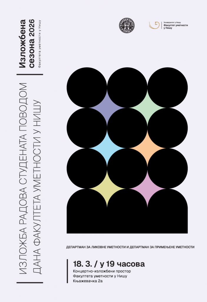 Изложбена сезона Факултета уметности у Нишу 2026 – Изложба радова студената поводом Дана Факултета уметности у Нишу 16/03/2026 Среда, 18. март 2026. године у 19 часова, Концертно-изложбени простор Факултета уметности у Нишу (Књажевачка 2а) Related Posts Концертна сезона ФУ у Нишу – Марија Ђорђевић, сопран и Марија Динов, клавир 16/03/2026 Концерт: Милица Петровић, виолина и Милош Јеротић, клавир 09/03/2026 Мајсторске радионице професора Романа Видашека и Илдико Јухас на Факултету уметности у Нишу 03/03/2026 Comments are closed.