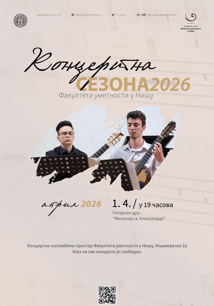 Среда, 1. април 2026. године у 19 часова, Концертно-изложбени простор ФУ у Нишу (Књажевачка 2а)