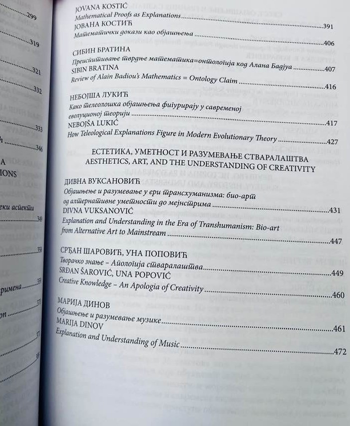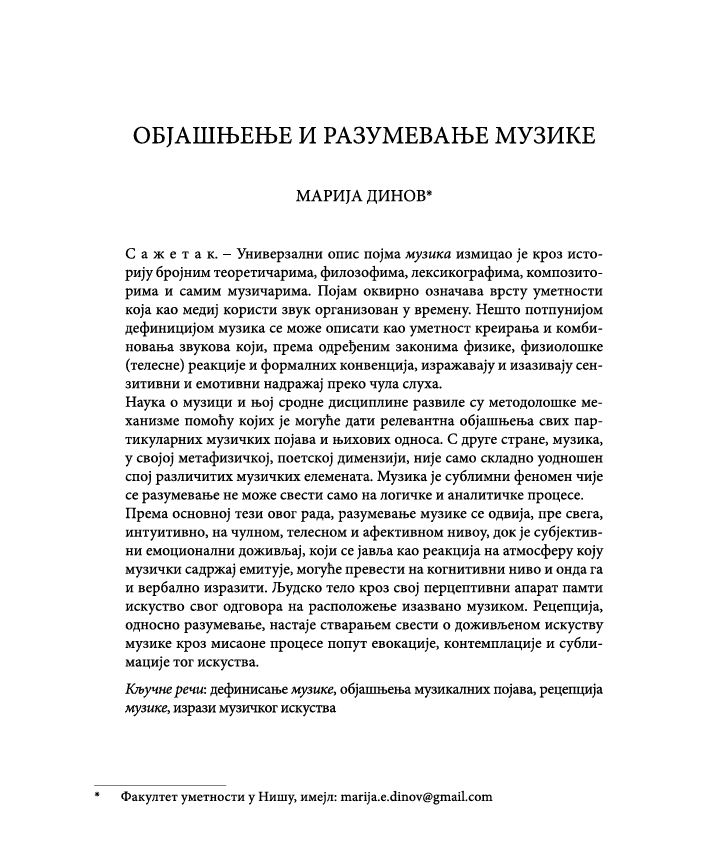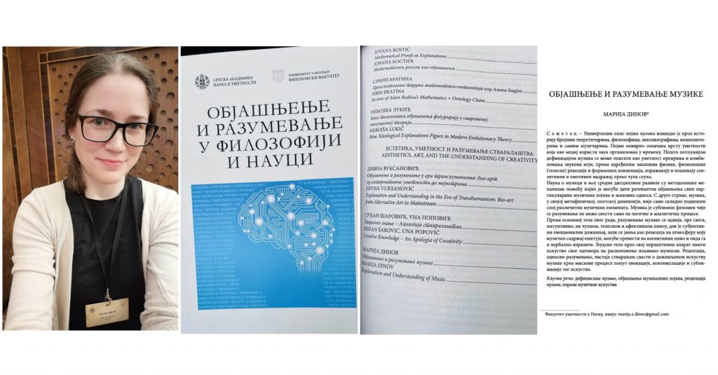 Рад др Марије Динов, доцента на Факултету уметности Универзитета у Нишу, под насловом „Објашњење и разумевање музике“, објављен је у зборнику радова “Објашњење и разумевање у филозофији и науци”, који је проистекао из истоименог међународног научног скупа одржаног у Српској академији наука и уметности од 5. до 7. децембра 2023. године.