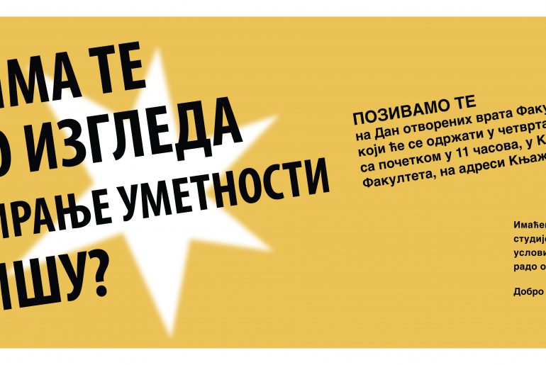 Позивамо те на Дан отворених врата Факултета уметности у Нишу, који ће се одржати у четвртак, 3. јула 2025. године, са почетком у 11 часова, у Концертно-изложбеном простору Факултета, на адреси Књажевачка 2а.
