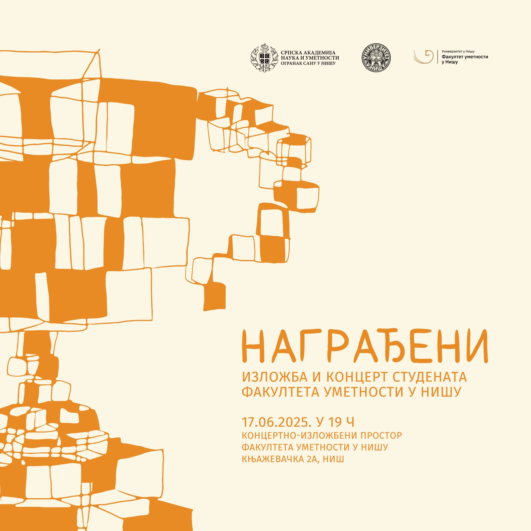 We are pleased to invite you to the ceremonial opening of the exhibition and concert of the Faculty of Arts in Niš students, united under the name Awarded, on Tuesday, 17th June 2025 at 7 pm, in the Faculty of Arts, University of Niš Concert – Exhibition Hall.