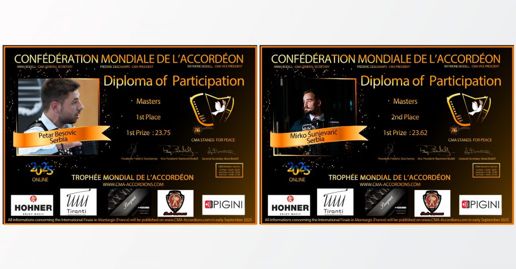 At the prestigious international competition Trophée Mondial de l’Accordéon (CMA Online) 2025, students of the Faculty of Arts in Niš achieved notable results in the Masters category: