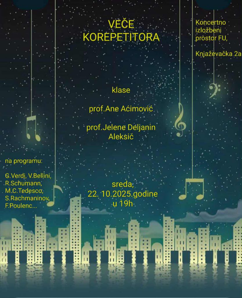 On Wednesday, 22nd October 2025, at 7 pm, in the Faculty of Arts Concert and Exhibition Hall, Knjaževacka 2a, a student concert “Accompanist Evening” will be held. Students from the Piano Department, in the accompanist classes of Prof. Ana Aćimović and Prof. Jelena Deljanin Aleksić, in cooperation with students from other performing departments, will participate.