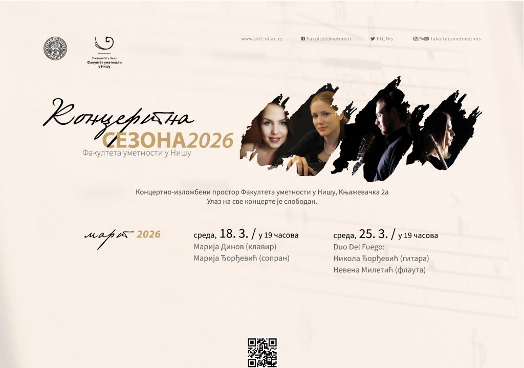 18. mart 2026. godine – Marija Đorđević, sopran i Marija Dinov, klavir – Koncertno-izložbeni prostor FU u Nišu, 19 časova 25. mart 2026. godine – Duo Del fuego: Nevena Miletić, flauta i Nikola Đorđević, gitara – Koncertno-izložbeni prostor FU u Nišu, 19 časova