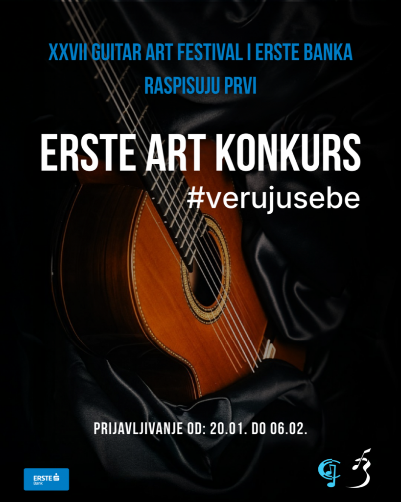Guitar Art Festival u saradnji sa Erste Bankom organizuje PRVI ERSTE ART KONKURS #verujusebe. Reč je o nagradi za izvrsnost u 2025. godini koja podrazumeva nastup na Guitar Art Festivalu 2026 i tri novčane nagrade od po 1.000 EUR za troje najboljih mladih gitarista i gitaristkinja Srbije! U okviru konkursa #verujusebe, biramo tri pobednika/ce – po jednog sa svakog nivoa muzičkog obrazovanja (osnovna i srednja muzička škola, kao i jednog studenta/studentkinju) – koji će osvojiti prestižnu nagradu i priliku da postanu deo svetske gitarske zajednice tokom XXVII Guitar Art Festivala.