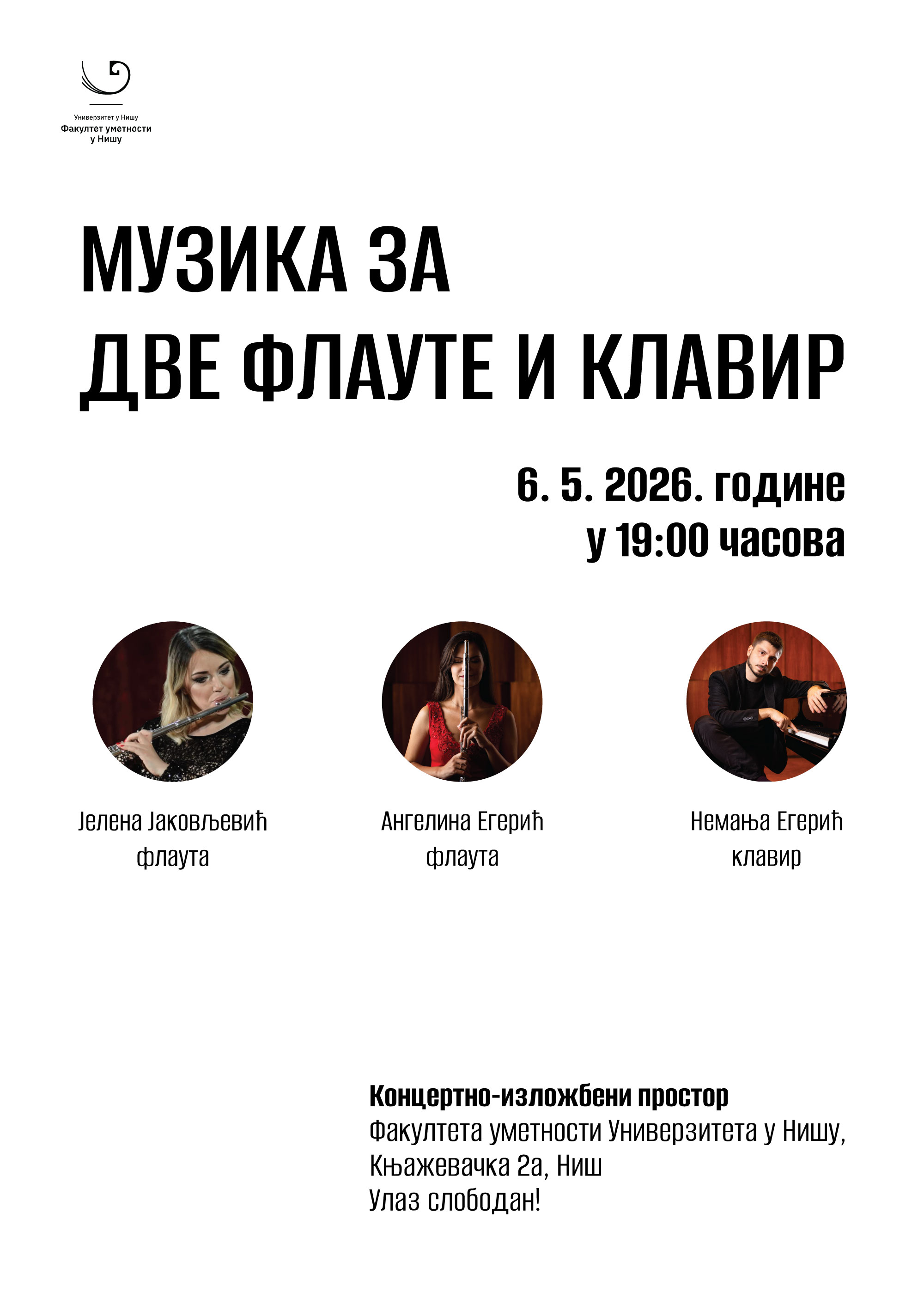 Sreda 6. maj 2026. godine u 19:00 časova, Koncertno-izložbeni prostor Fakulteta umetnosti u Nišu (Knjaževačka 2a)