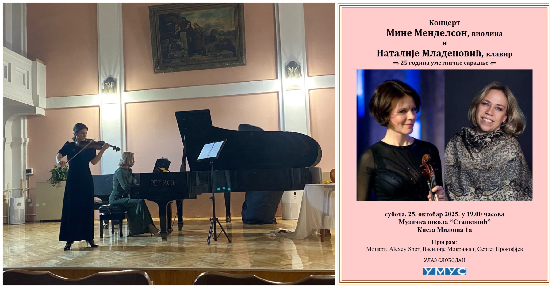Redovni profesor Fakulteta umetnosti u Nišu, violinistkinja dr um. Mina Mendelson održala je celovečernji koncert 25. 10. 2025. godine u Svečanoj sali MŠ „Stanković“ u Beogradu, sa pijanistkinjom Natalijom Mladenović, u organizaciji UMUS-a. Ovaj koncert je još jedan u nizu kojim Mina i Natalija obeležavaju 25 godina umetničke saradnje. Na programu su izvedena dela W. A. Mozarta (Rondo C dur), zatim Vase Mokranjca (Stara pesma i igra), S. Prokofjeva (Sonata za violinu i klavir D dur, op. 94bis) i premijerno u Srbiji – Aleksey Shore: Sonata za violinu i klavir br. 1.