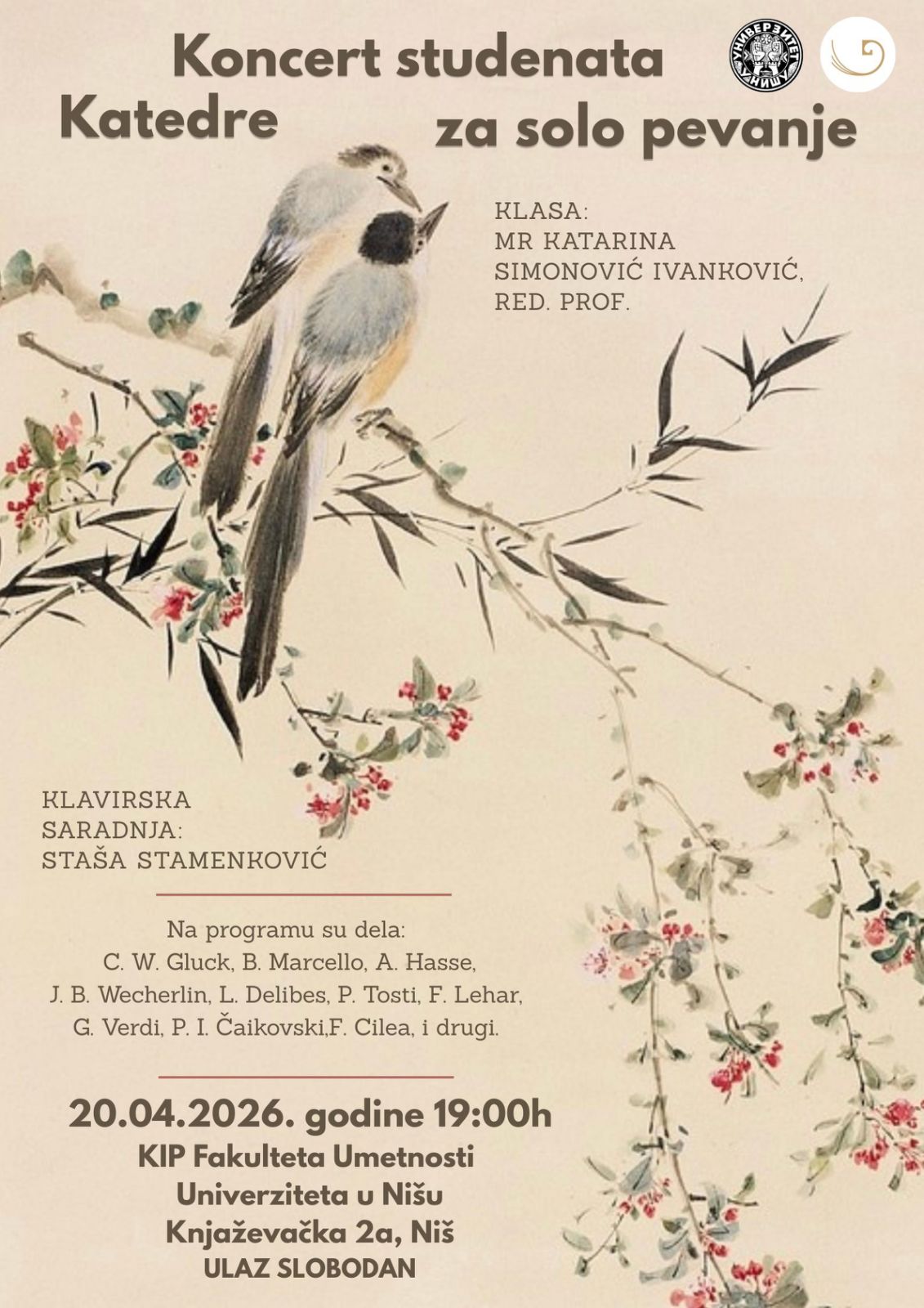 U ponedeljak, 20. aprila 2026. godine sa početkom u 19.00 časova, u Koncertno-izložbenom prostoru Fakulteta umetnosti u Nišu (Knjaževačka 2a), biće održan koncert studenata Katedre za solo pevanje iz klase mr Katarine Simonović Ivanković, red. prof.