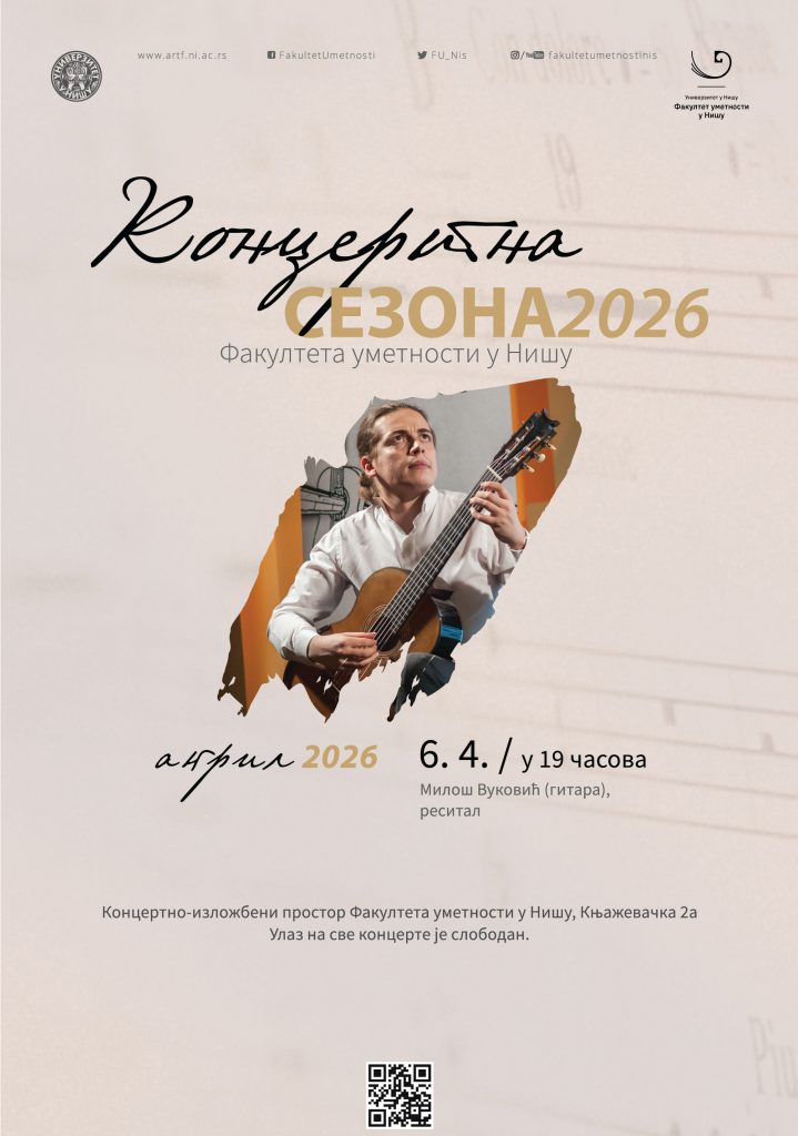Ponedeljak, 6. april 2026. godine u 19 časova, Koncertno-izložbeni prostor Fakulteta umetnosti u Nišu (Knjaževačka 2a)