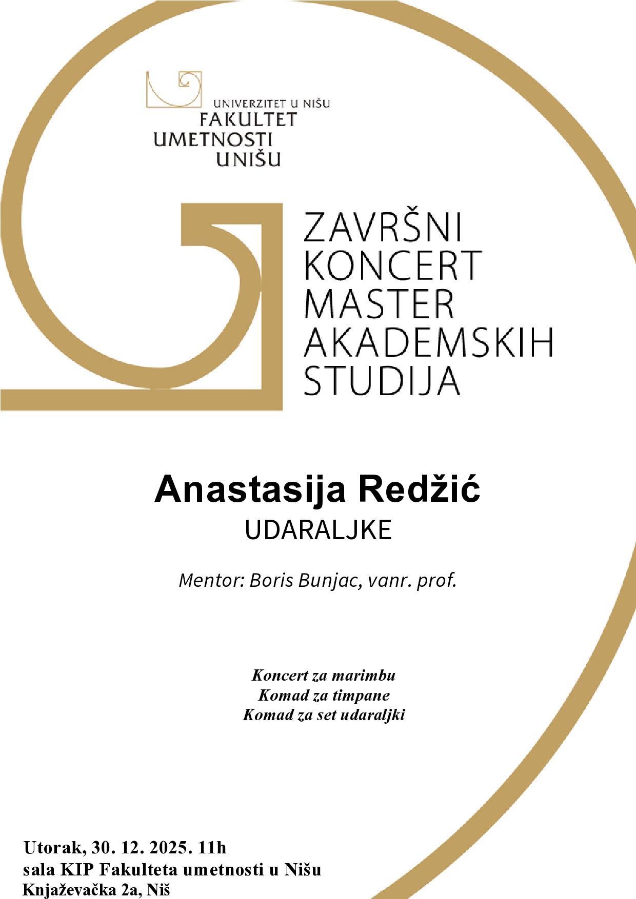 Odbrana završnog rada Master akademskih studija – Anastasija Redžić – Izvođačke umetnosti, udaraljke 16/12/2025 Mentor: Boris Bunjac, vanr. prof. Program: Koncert za marimbu Komad za timpane Komad za set udaraljki Utorak, 30. 12. 2025. u 11 sati Sala KIP Fakulteta umetnosti u Nišu, Knjaževačka 2a Prev Post Konačna rang-lista – Muzička pedagogija – MAS 2025/2026. – Drugi konkursni rok 11/12/2025 Next Post Celovečernji koncert Borisa Pećanca sa Aleksom Spasićem i Nikolom Tomićem u Vrnjačkoj Banji 17/12/2025 Related Posts Istorija muzike – raspored polaganja predispitnih obaveza u januarskom roku 30/01/2026 Premijera opere “Zamak Plavobradog” Bele Bartoka 27/01/2026 Konkurs za IV Mitrovičku umetničku rezidenciju 27/01/2026 Comments are closed.