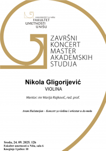 Odbrana završnog rada Master akademskih studija – Nikola Gligorijević – Izvođačke umetnosti, violina 20/09/2025 Mentor: mr Marija Rajković, red. prof. Program: Aram Hačaturjan – Koncert za violinu i orkestar u de-molu Sreda, 24. 09. 2025. u 12 sati Fakultet umetnosti u Nišu, sala 6 Kneginje Ljubice 10 Prev Post Samostalna izložba ODRAZ: Dizajn i umetnost Sanje Dević u Galeriji Narodnog muzeja u Vranju 18/09/2025 Next Post Resital Stevana Spalevića na Grig Akakdemiji u Bergenu 22/09/2025 Related Posts Odbrana završnog rada Master akademskih studija – Marija Ratkov – Izvođačke umetnosti, harmonika 08/11/2025 Obaveštenje studentima o upisu na II, III i IV godinu OAS 2025/2026. godine 06/11/2025 Jedna od najpopularnijih opera na svetu – Pučinijevi “Boemi”, 8. novembra na velikom platnu Cineplexx Niš bioskopa 06/11/2025 Comments are closed.