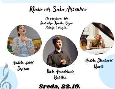 U Koncertnoj sali OŠ “Vladimir Đorđević“ u Aleksincu, 22.10.2025. godine sa početkom u 19 časova, studenti Odseka za Solo pevanje Anđela Jokić – sopran i…