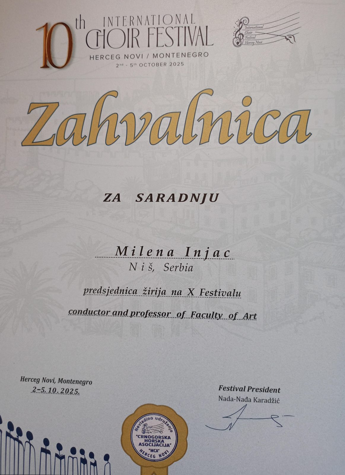 Prof. dr um. Milena Injac, dirigent i dekan Fakulteta umetnosti u Nišu, bila je predsednik žirija jubilarnog 10. Međunarodnog festivala horova u Herceg Novom u Crnoj Gori. Članovi žirija su bili Jasenka Ostojić (Hrvatska), Enriko Miaroma (Italija) i Jarun Bekers (Belgija). Festival je održan od 2. do 5. oktobra 2025. godine uz učešće 29 horova iz različitih zemalja regiona i Evrope u više takmičarskih kategorija i revijalnom delu festivala. Festival je podržan od opštine Herceg Novi, kao i Ministarstva kulture i medija.