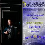 Strahinja Marković, student IV godine osnovnih akademskih studija u klasi dr um. Stevana Spalevića, vanr. prof. osvojio je prvu nagradu (98,25 bodova) u F kategoriji na 30. Međunarodnom takmičenju mladih pijanista koje je održano od 22. do 26. aprila 2026. godine u Šapcu.