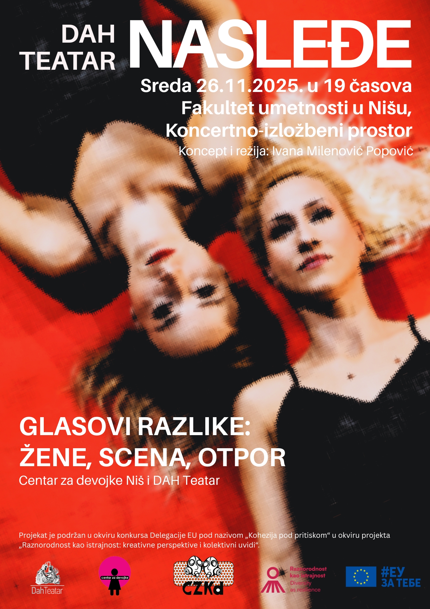 Predstava Nasleđe, DAH Teatra održaće se u sredu 26. novembra u 19 časova u Koncertno-izložbenom prostoru Fakulteta umetnosti u Nišu. Predstava govori o marginalizovanju žene u lancu nasleđivanja, odricanju od nasledstva pod uticajem tradicije, familije i koje posledice to ostavlja na žene. Dekonstruiše unutrašnji sukob žene rastrzane između pristajanja i otpora. Ispituje mit o ženskoj bespomoćnosti i mehanizme patrijarhata koji su ugrađeni u društvene i lične narative.