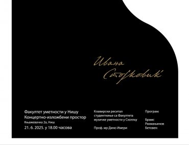 Клавирски реситал Иване Стојковик, студенткиње са Факултета музичке уметности у Скопљу, одржаће се у Концертно-изложбеном простору Факултета уметности Универзитета у Нишу, 21. јуна 2025. године…